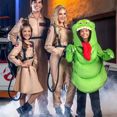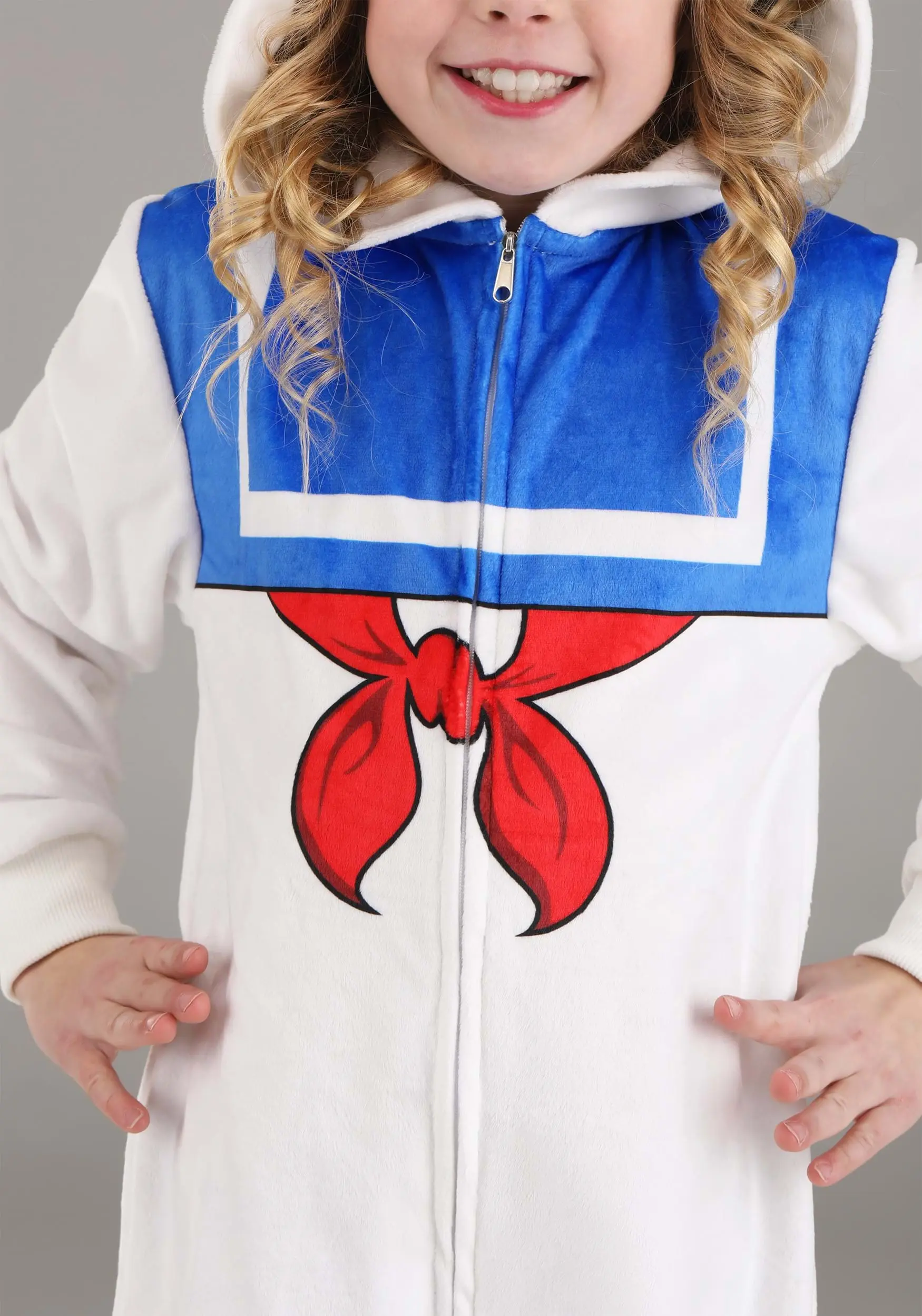 The plush costume jumpsuit features an all-white design along with blue and red printing based on Stay Puft’s sailor style. A front zipper keeps the costume fitting fine and the illustrated hood features the look of the Stay Puft Marshmallow Man’s face. Topped with a puffy sailor hat and red ribbon, this is sure to be a favorite for Halloween outings or for nights in with your favorite movie marathons.