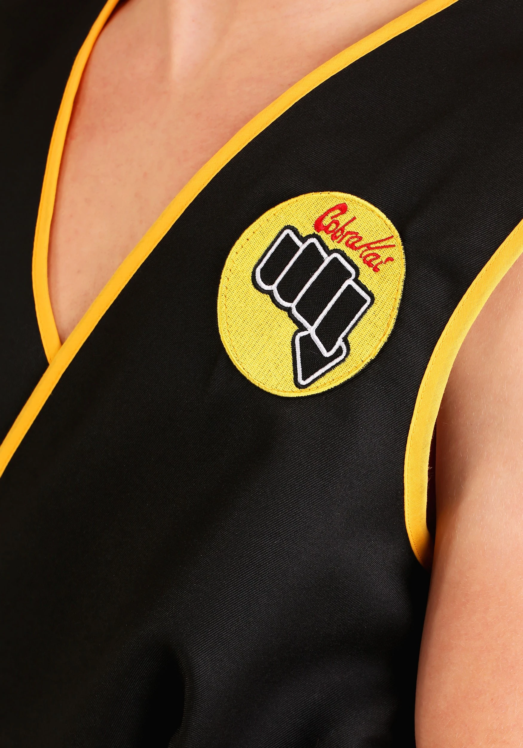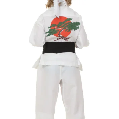 This one is officially licensed and exclusive, you won’t find it anywhere else. It’s 100% polyester poplin fabric. The tunic shirt has a self-fabric waist tie, gold edging, and an embroidered Cobra Kai logo. The pants have an elastic waist and embroidered patches featured on each leg. The twill belt is 2 inches wide, and the headband is 2 inches wide with an embroidered patch in the center.