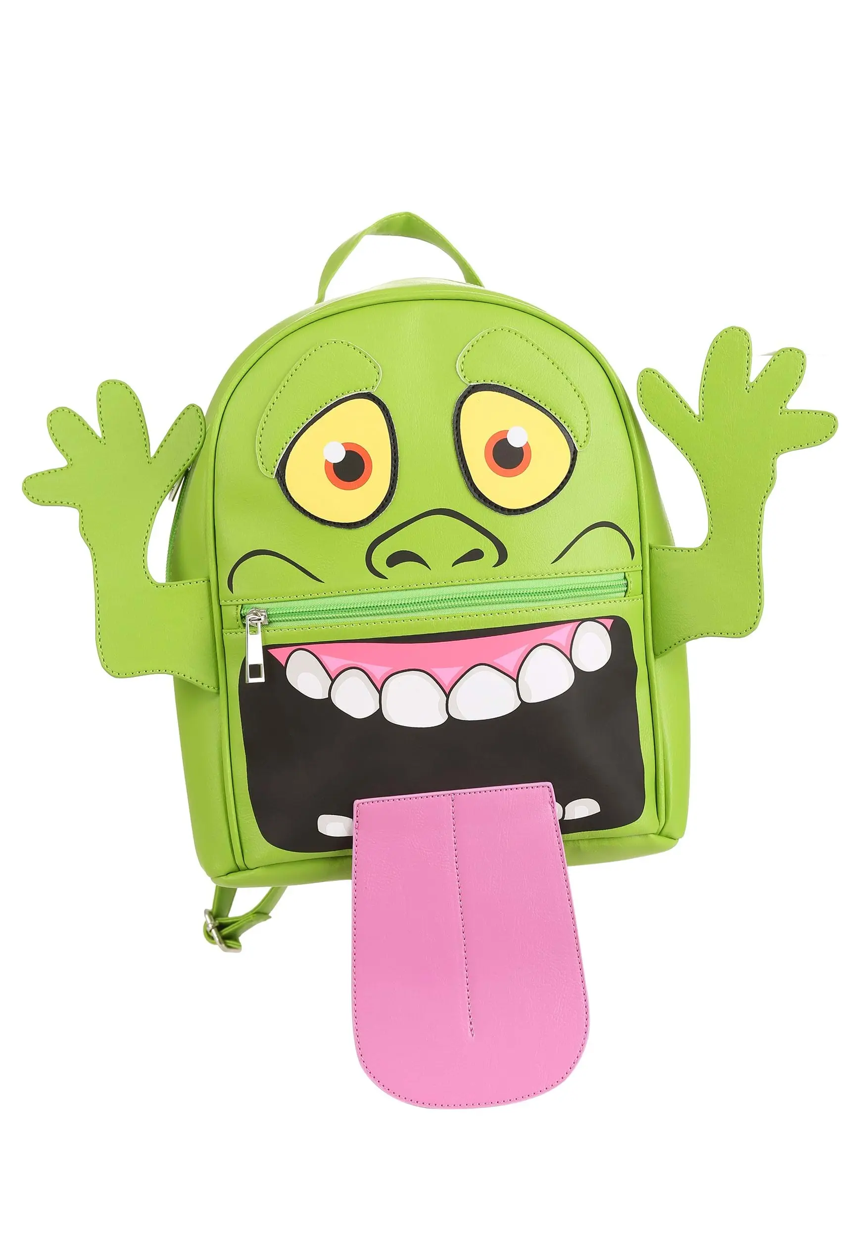 This fully-licensed Ghostbuster backpack features the mischievous Slimer. It was designed by our in-house creative team. Standing out with an eerie green color, the front of the backpack shows Slimer’s greedy eyes while the front pocket flaunts Slimer’s wide-open mouth and hanging tongue. Zipping closed along the main pocket as well as the front accessibility pocket, the backpack has adjustable straps to keep you comfortable.Â