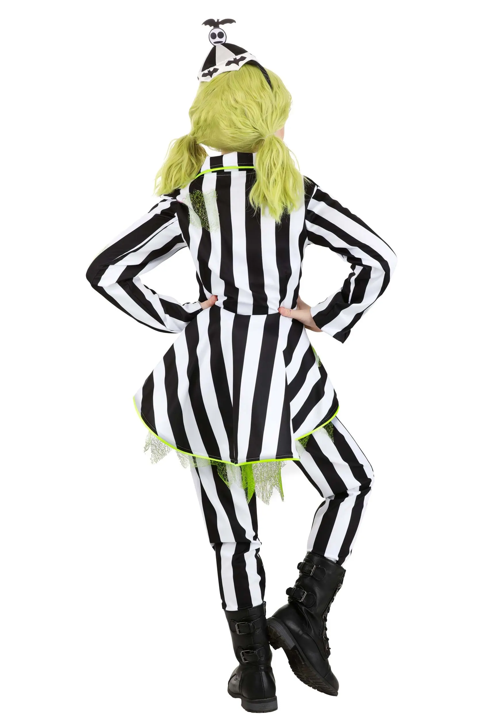 Dress as an unforgettably outrageous ghoul in this exclusive Showtime Ghost Costume for Kids! The white satin shirt front with an attached black necktie looks fabulous when worn beneath the black-and-white-striped peplum jacket. The jacket buttons up the center front, is edged with bright green piping, and is trimmed with green mesh ruffles. The matching leggings have an elastic waistband and can be tucked into the boots of your choice. The included fabric-covered headband is topped with a foam-backed satin hat that’s decorated with bats, stripes, and a stylized cartoon-eque skull.